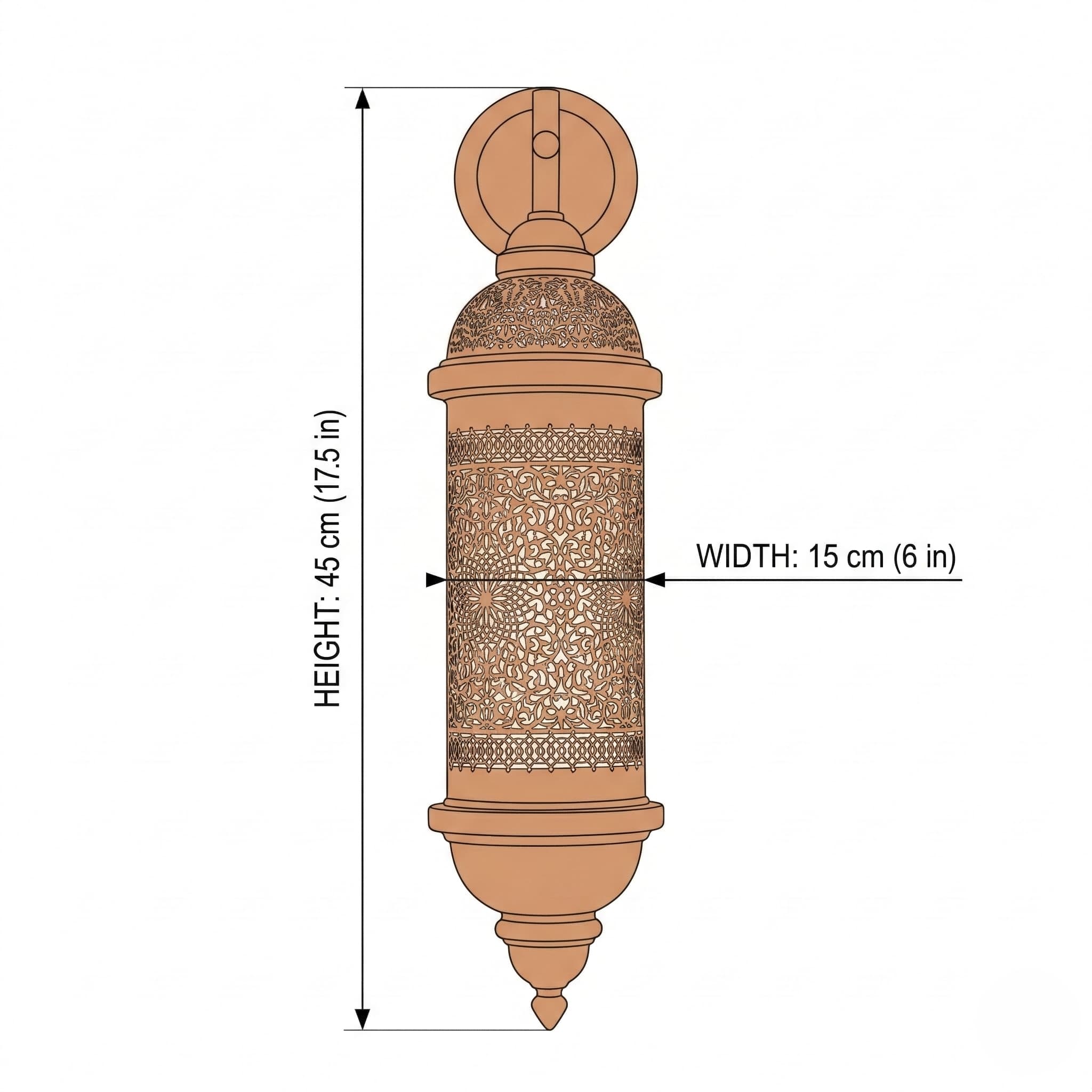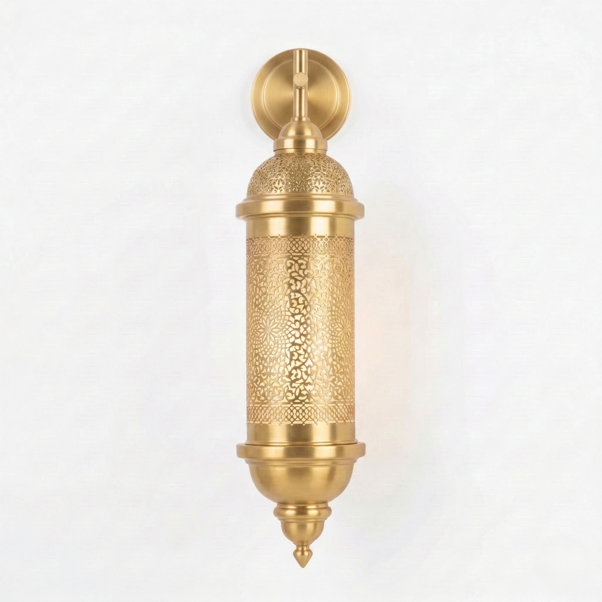 KEY FEATURES: ✓ Material & Construction: Solid brass with hand-pierced filigree openwork, satin gold finish ✓ Shadow Effect: Projects dramatic geometric light patterns across walls and ceilings ✓ Versatility: Ideal for bedrooms, hallways, living rooms, restaurants, and hotel lobbies ✓ Dimensions & Weight: 17.5″ H x 6″ W (45 x 15 cm), wall-mount bracket included ✓ Care & Maintenance: Wipe with soft dry cloth; polish with brass cleaner every 6–12 months ✓ Artisan Story: Handcrafted by Abdul Jalil, master dinanderie artisan with 25+ years of experience ✓ Installation: Standard E14/E12 bulb socket, hardwire installation (electrician recommended) ✓ Pairs Beautifully: Install two flanking a doorway, mirror, or headboard for symmetrical impact