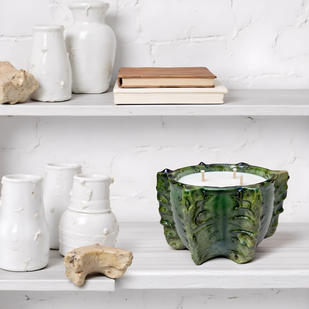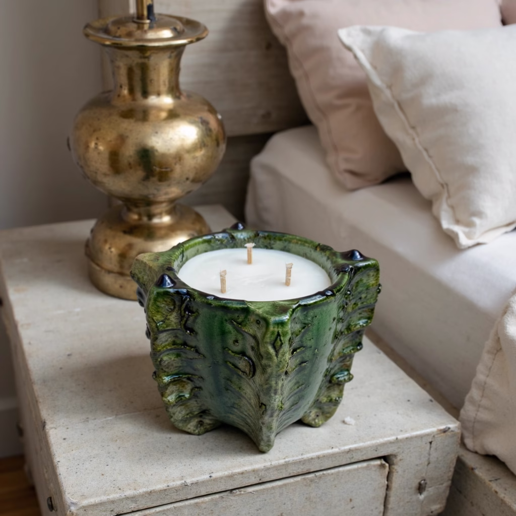 This triple-wick candle is housed in a unique ceramic bowl, showcasing Tamegroute’s signature deep green glaze achieved through traditional techniques passed down through generations. The textured leaf design and organic shape make each piece a distinctive work of art that adds character to any room.