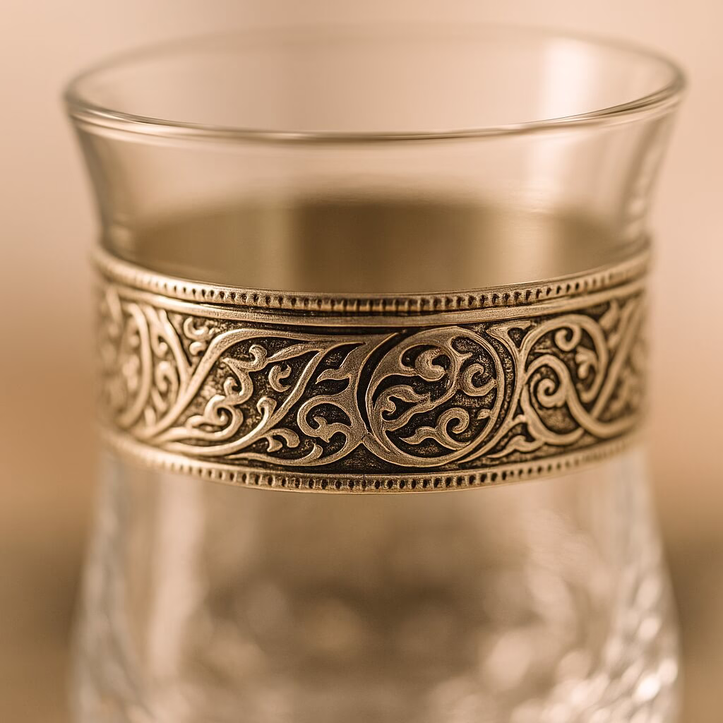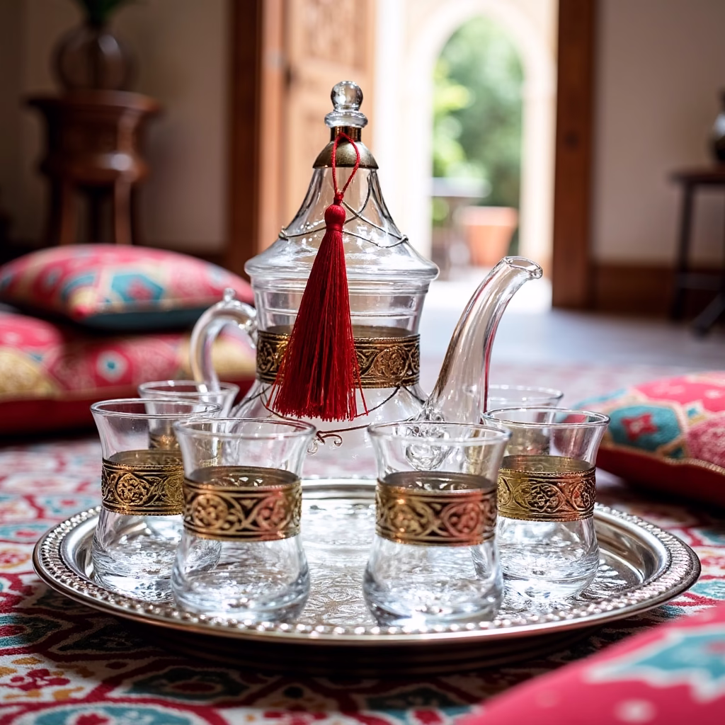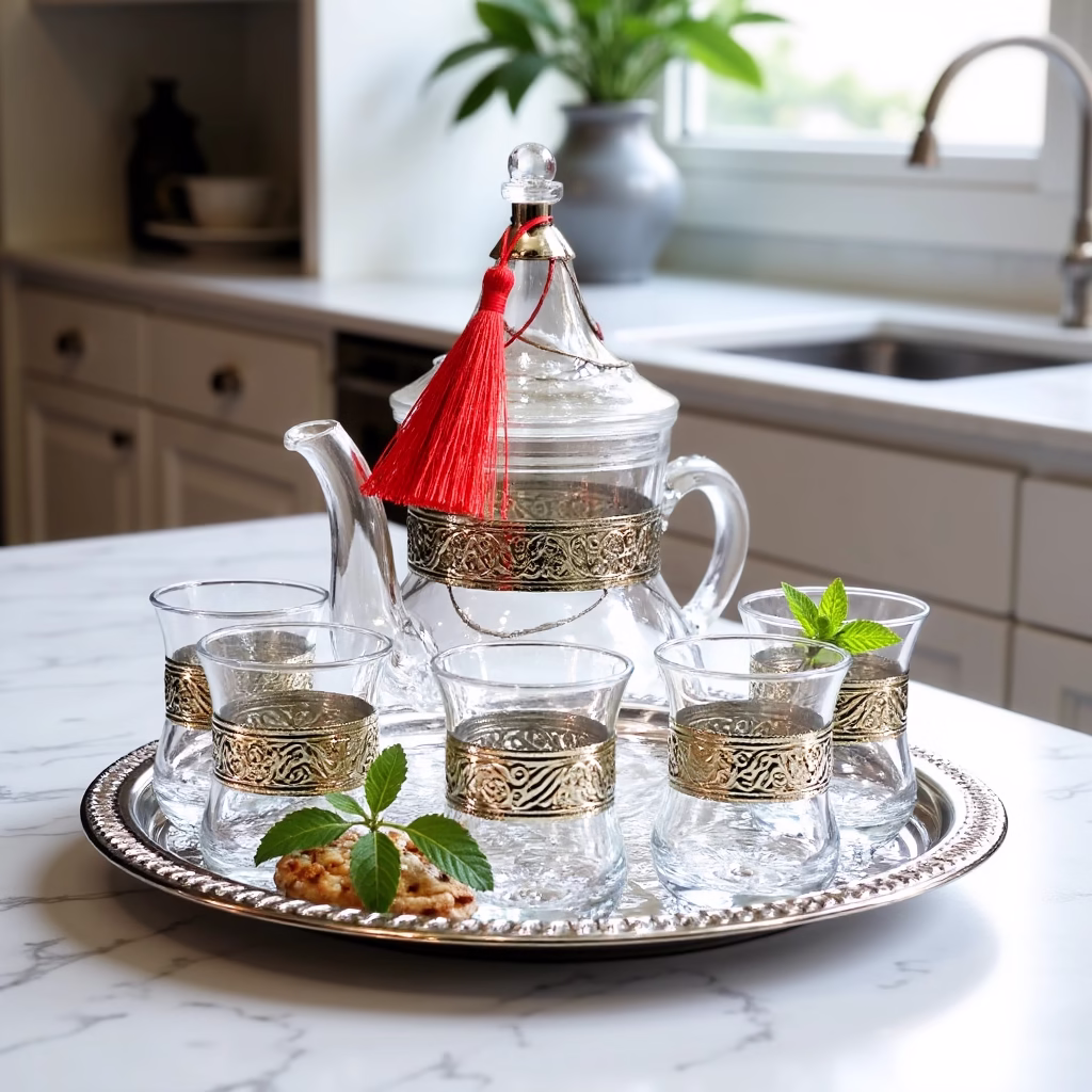 Bring the elegant tradition of Moroccan tea culture into your home with our exquisite handcrafted glass tea set. This stunning 8-piece collection combines the transparency of fine glass with intricate silver engravings, creating a magnificent ensemble that transforms tea service into a sophisticated art form.