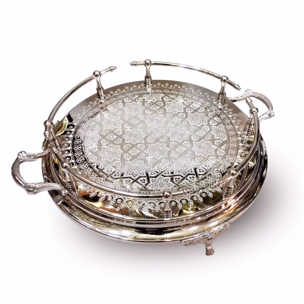Hand-Engraved Silver Large Round Tray with Decorative Handles and Feet – Authentic Moroccan Craftsmanship