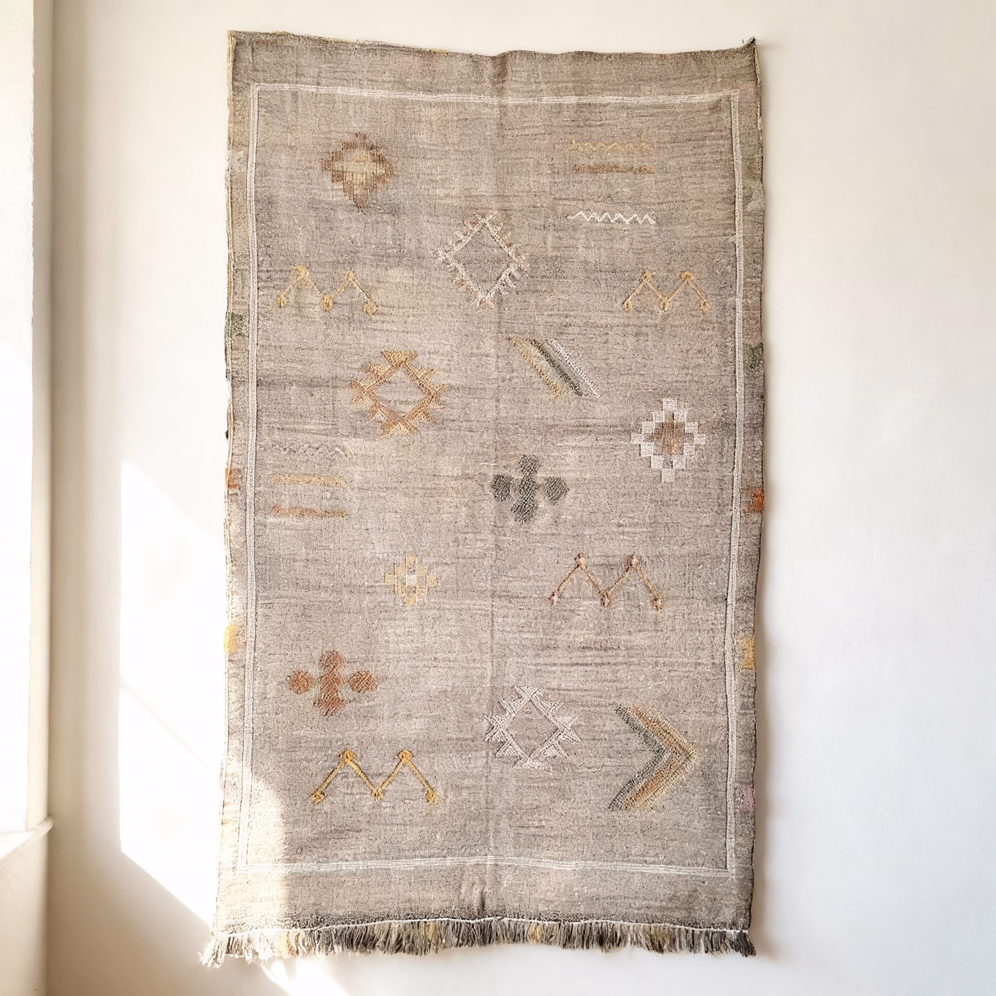 This exceptional cactus rug represents centuries of Berber weaving tradition, where skilled artisans transform natural Agave Sabra fibers into lustrous, silk-like threads with remarkable durability and beauty. The sophisticated gray base features an elegant geometric pattern with traditional diamond motifs, crosses, and tribal symbols in warm terracotta, cream, and subtle blue accents, creating a refined neutral palette that complements any interior style.