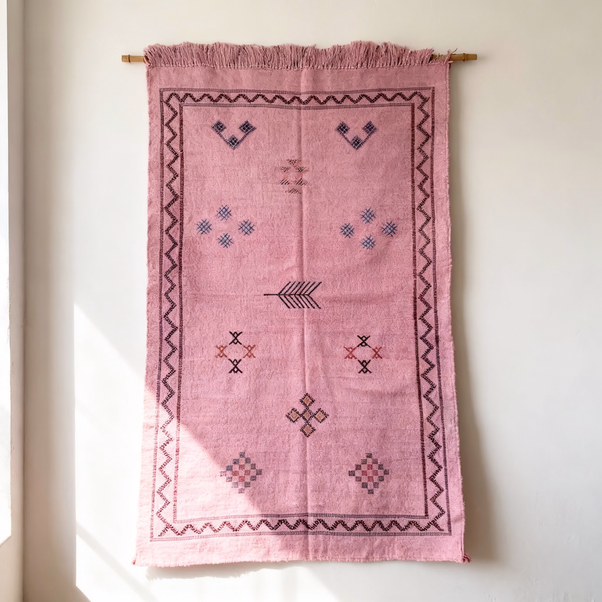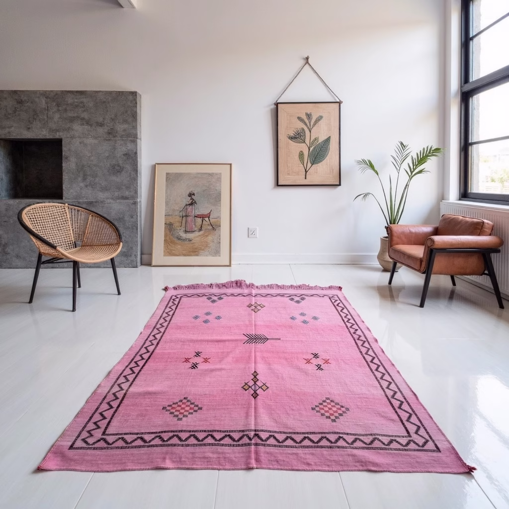 This versatile moroccan sabra rug serves as an ideal centerpiece for various design aesthetics. Perfect for modern feminine spaces where it adds warmth and cultural depth, bohemian interiors where it complements natural textures, or contemporary homes seeking authentic artistic elements. The soothing pink tones make it particularly suitable for bedrooms, reading nooks, or any space designed for relaxation and comfort.