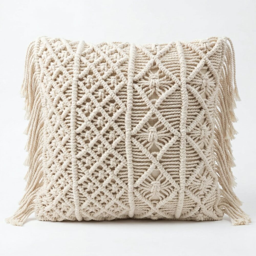 This handwoven macrame cushion cover brings the warmth of artisan knotwork into your living space. Crafted entirely by hand using natural cotton cord, each cover features an intricate diamond pattern created through traditional square knot and gathering knot techniques — a process that takes our artisans several hours per piece.
