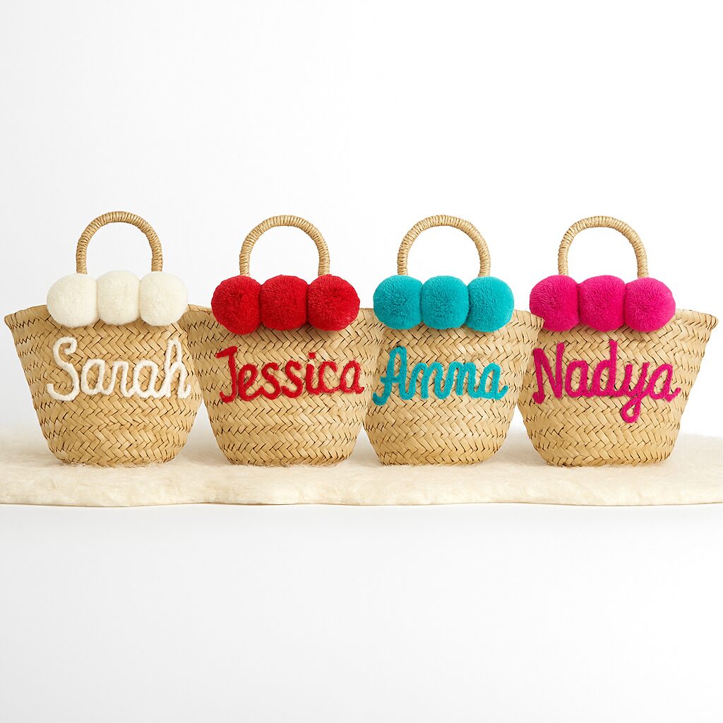 Each mini straw bag is meticulously handwoven by Moroccan artisans, combining traditional techniques with modern personalization. The bags feature custom-embroidered names and playful pom-pom decorations, creating the perfect blend of artisanal charm and personal touch.