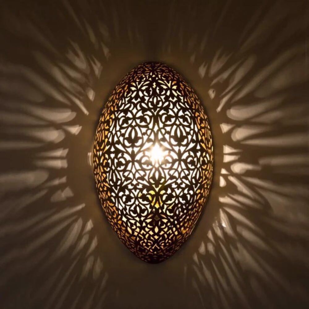 Enhance your space with our distinctive oval wall light, where organic form meets masterful Moroccan craftsmanship. This unique egg-shaped fixture creates an extraordinary display of light and shadow, bringing artistic sophistication to any interior setting.
