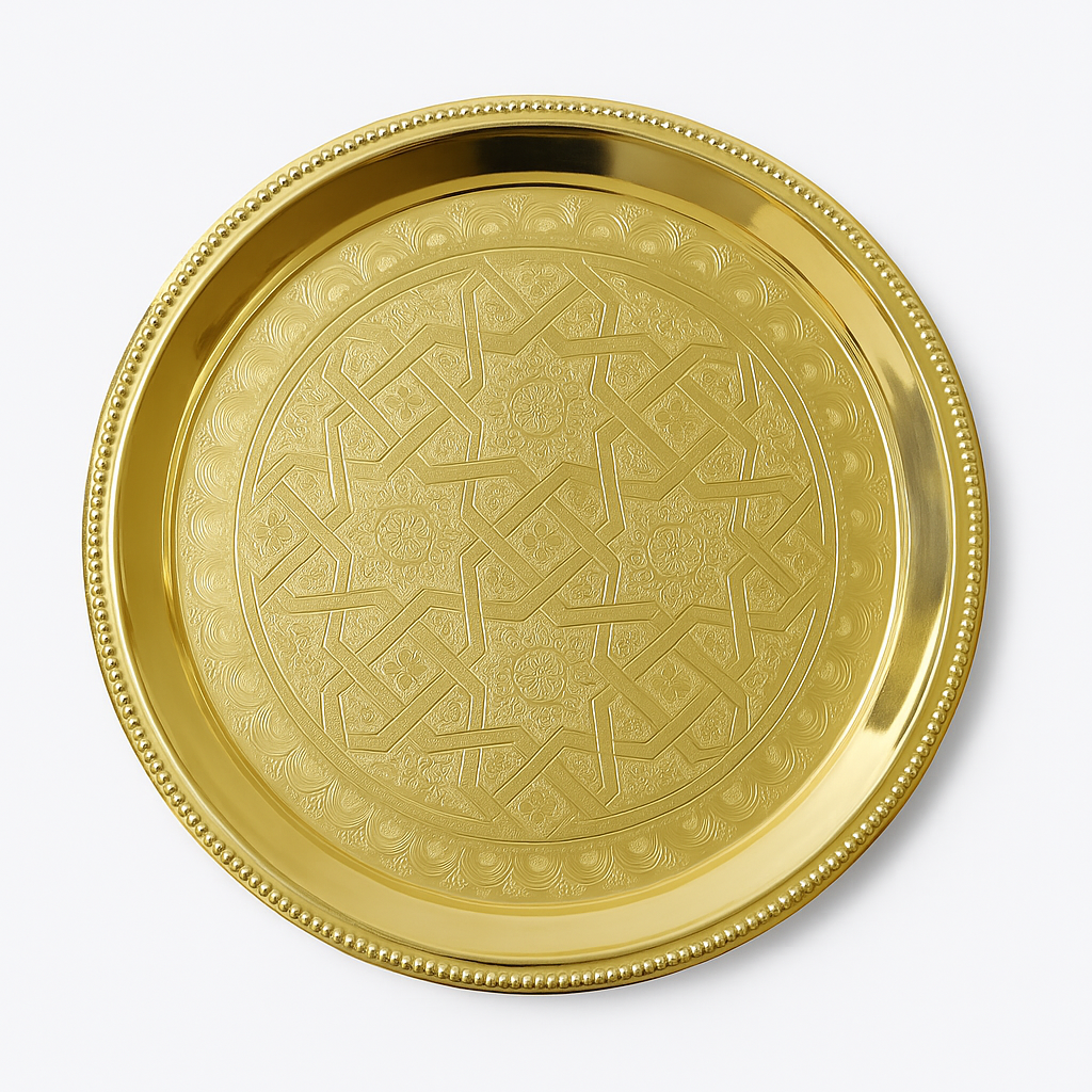 Extra Small – 25cm / 9.84" diameter Diameter: 25cm / 9.84 inches Serving Capacity: 2-3 people Weight Capacity: ~2kg / 4.4 lbs Approximate Weight: 0.5-0.8kg (empty) Perfect For: • Tea for two service (1 small teapot + 2 glasses) • Coffee and pastry service • Breakfast in bed • Office desk organization • Decorative wall hanging • Small appetizer presentation Best Use: Personal service, romantic settings, compact spaces Ideal Items: Small teapot, 2-3 glasses, small snack bowls Storage: Easy to store in cabinets or hang on walls ,Large – 45cm / 17.7" diameter Diameter: 45cm / 17.7 inches Serving Capacity: 8-10 people Weight Capacity: ~6kg / 13.2 lbs Approximate Weight: 2.5-3.5kg (empty) Perfect For: • Tea service for 8-10 people (1L teapot + 8-10 glasses) • Elaborate appetizer displays • Buffet-style service • Special occasion entertaining • Restaurant and café use • Statement centerpiece Best Use: Special occasions, large gatherings, semi-commercial use Ideal Items: Large teapot, 8-10 glasses, multiple serving bowls, elaborate spreads Entertaining: Perfect for hosts who love to impress Commercial: Suitable for small cafés and restaurants ,Medium – 35cm / 13.7" diameter Diameter: 35cm / 13.7 inches Serving Capacity: 4-6 people Weight Capacity: ~4kg / 8.8 lbs Approximate Weight: 1.2-1.8kg (empty) Perfect For: • Complete tea service for 4-6 people (800ml teapot + 6 glasses) • Appetizer platters • Dessert presentation • Brunch service • Coffee table centerpiece • Moderate entertaining Best Use: Family gatherings, dinner parties, standard entertaining Ideal Items: Medium teapot, 6 glasses, sugar bowl, snack plates, dates MOST POPULAR: Best-selling size for home use Versatility: Perfect balance of capacity and portability ,Medium-Large – 40cm / 15.7" diameter Diameter: 40cm / 15.7 inches Serving Capacity: 6-8 people Weight Capacity: ~5kg / 11 lbs Approximate Weight: 1.8-2.5kg (empty) Perfect For: • Full tea service for 6-8 people (1L teapot + 6-8 glasses) • Large appetizer spreads • Mezze platter presentation • Holiday entertaining • Traditional Moroccan hospitality • Living room coffee table display Best Use: Large family gatherings, traditional tea ceremonies Ideal Items: Large teapot, 6-8 glasses, multiple snack bowls, pastries Traditional Size: Authentic Moroccan family serving size Presentation: Ample space for elaborate arrangements ,Small – 30cm / 11.8" diameter Diameter: 30cm / 11.8 inches Serving Capacity: 3-4 people Weight Capacity: ~3kg / 6.6 lbs Approximate Weight: 0.8-1.2kg (empty) Perfect For: • Tea service for 3-4 people (500ml teapot + 3-4 glasses) • Coffee service with cookies • Light snack presentation • Breakfast service • Side table display • Daily family use Best Use: Daily tea service, small gatherings, casual entertaining Ideal Items: Small-medium teapot, 3-4 glasses, sugar bowl, small plate Most Popular: Great starter size for home use |