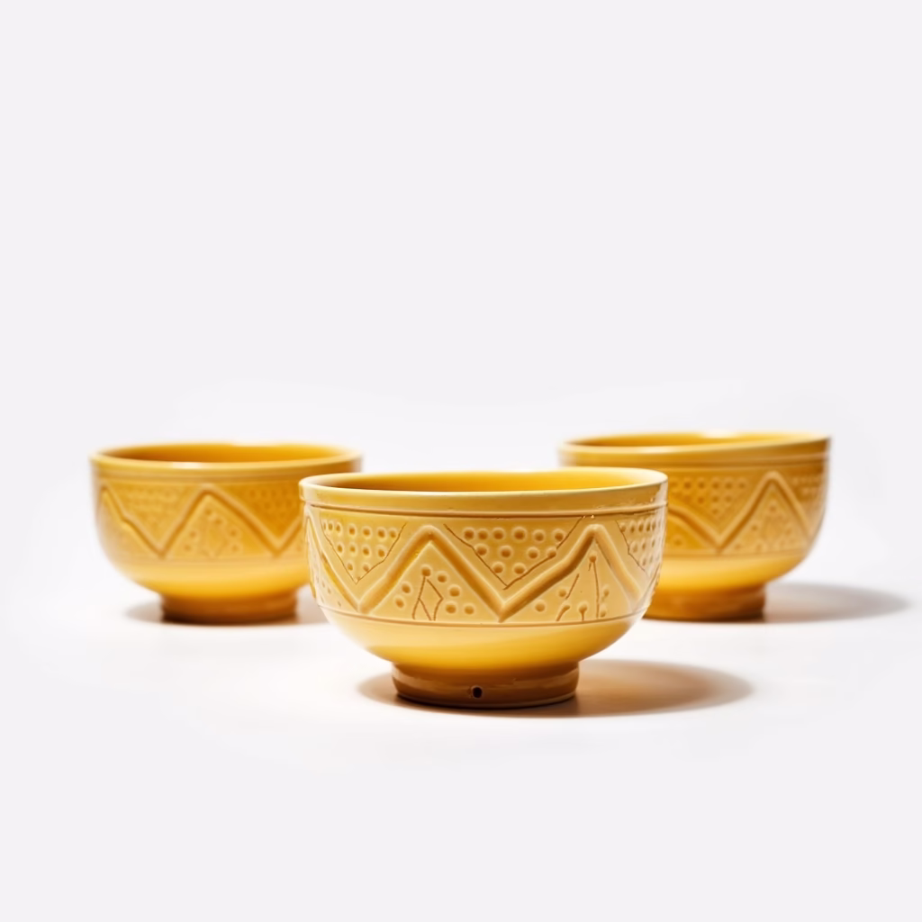 Our exceptional ceramic bowl set represents the pinnacle of Moroccan ceramic artistry, where each piece is individually handcrafted using traditional techniques passed down through generations of master artisans. The creation process begins with carefully selected clay that is shaped, fired, and then meticulously hand-engraved with authentic Moroccan tools to create the distinctive dimensional patterns.