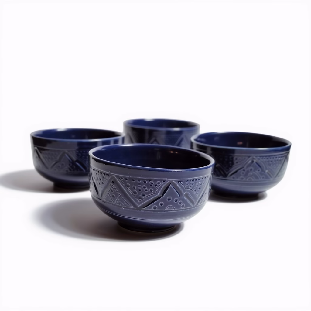 Hand-Engraved Ceramic Bowl Set of 4 with Traditional Moroccan Geometric Patterns, 10cm