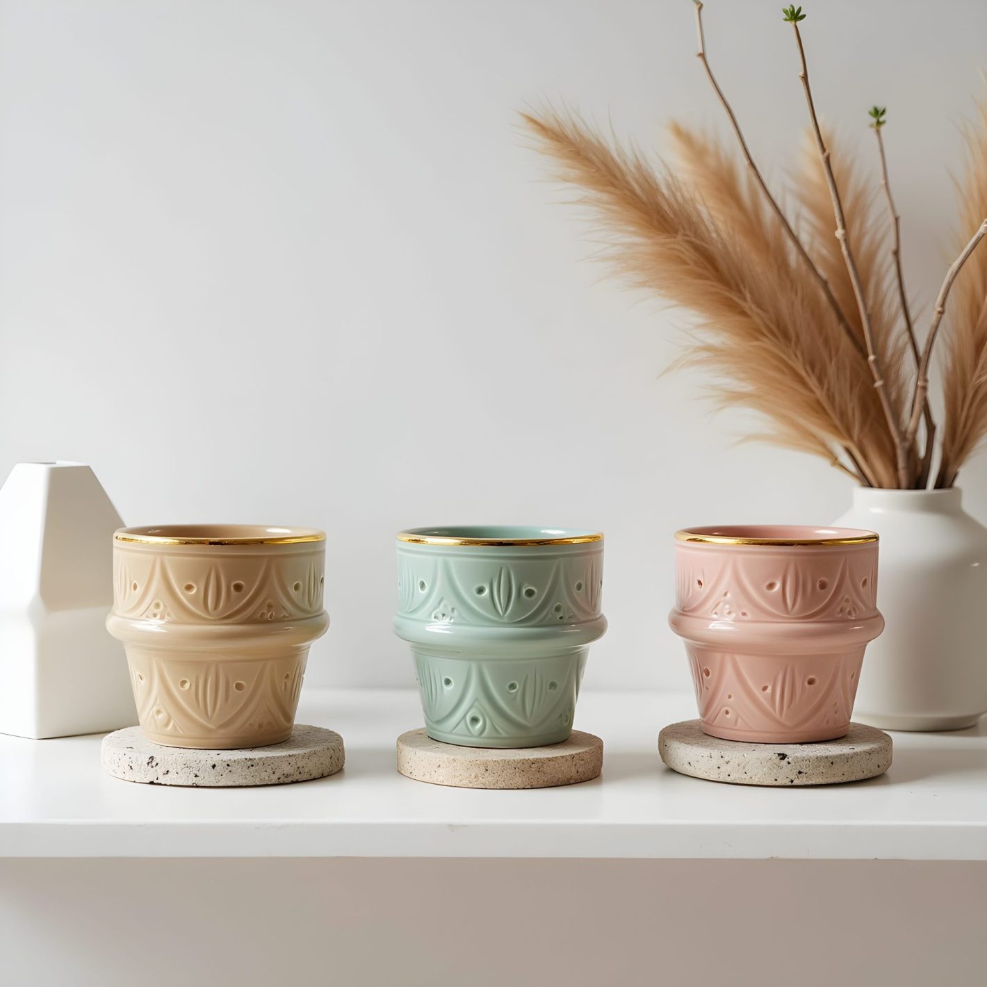 Indulge in the rich and delicious taste of espresso with this set of four hand-decorated ceramic cups from Morocco. Each cup is adorned with pure gold ornaments, giving them a unique and luxurious look. The cups are made of durable ceramic material and are perfect for a quick espresso shot or for serving small desserts.