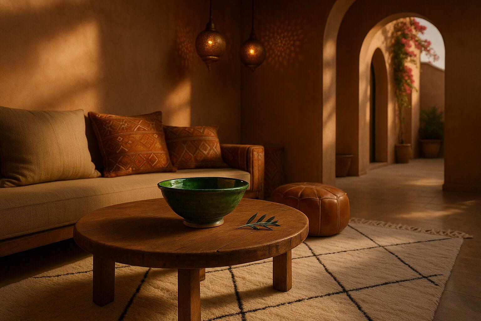 Tamegroute ceramic bowl in a Moroccan boutique hotel lounge styled with terracotta tones and handcrafted decor.
