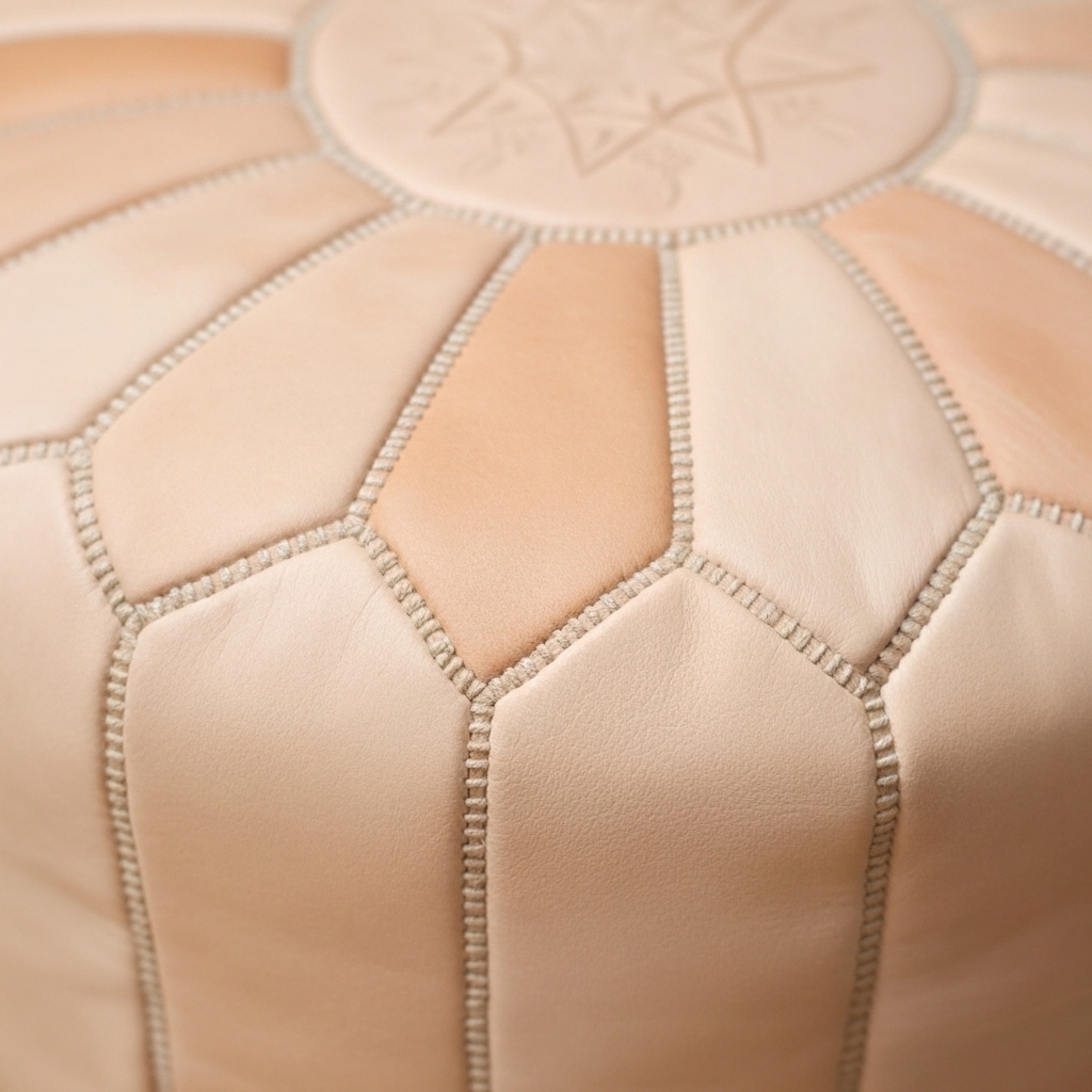 Each pouf is meticulously crafted by Omar, a master leather artisan working in Marrakech’s historic medina. The creation process spans 3-4 days per piece, beginning with hand-selecting premium undyed goatskin leather that retains its natural tan color and organic grain patterns. The centerpiece showcases an intricate eight-pointed star embroidery with radiating linear details, hand-stitched in contrasting cream thread that beautifully highlights the warm leather tones. Sixteen to eighteen geometric panels—trapezoidal and pentagonal shapes—radiate from the central medallion, creating architectural dimension and visual interest. Every seam features precise whipstitching with consistent tension, transforming functional construction into decorative artistry. The natural variations in color and texture showcase the leather’s authentic, chemical-free quality.