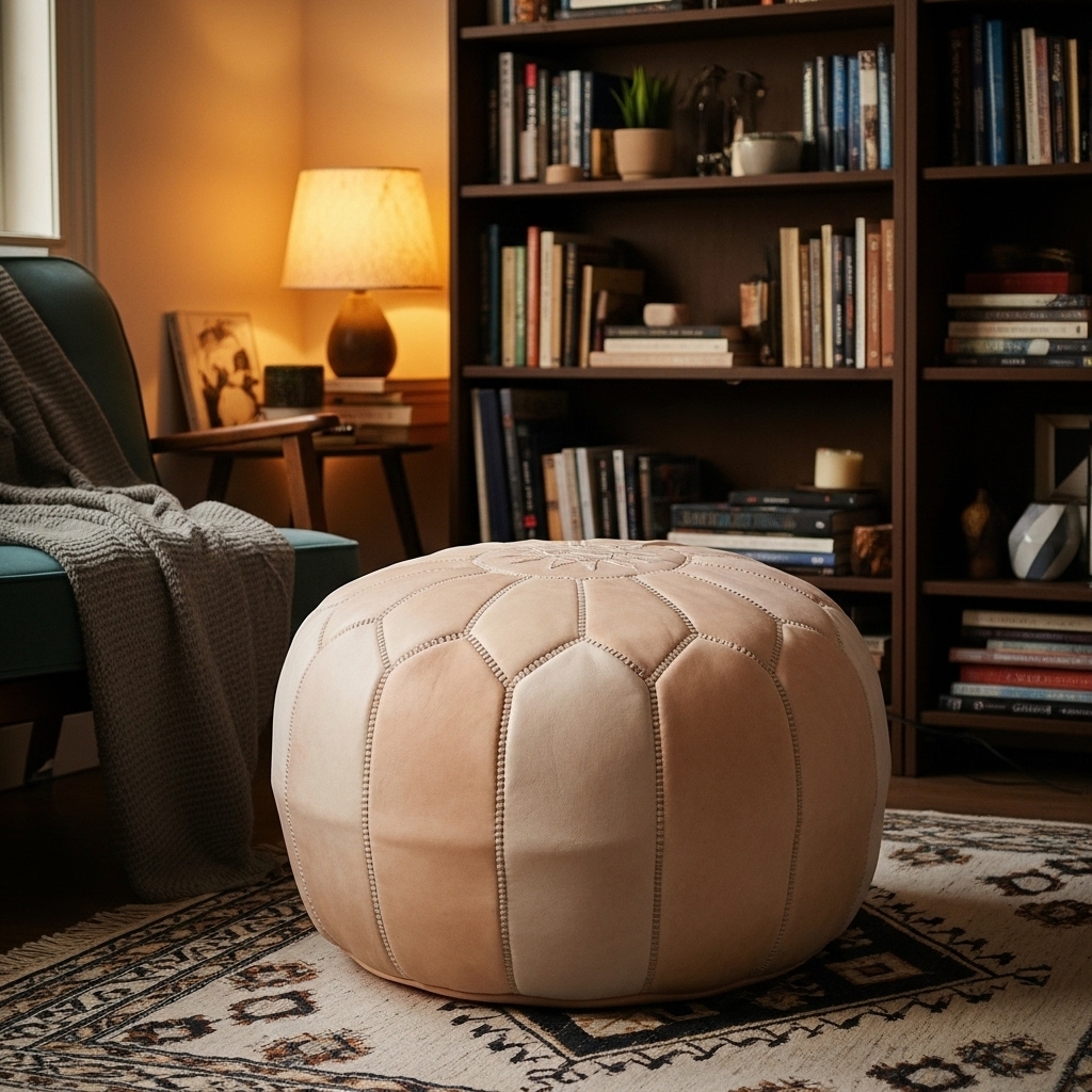 Choosing this undyed leather ottoman represents your commitment to sustainable, chemical-free home furnishings. The natural tanning process eliminates harmful dyes and synthetic chemicals, making this pouf safe for homes with children, pets, and sensitive individuals. The space-saving design delivers multi-functional furniture without cluttering your home, perfect for minimalist living. Unlike mass-produced pieces, this natural leather floor pouf develops a rich honey-brown patina over time, gaining warmth and character with each use. Your purchase supports artisan families preserving centuries-old leatherworking traditions while choosing environmental responsibility over artificial aesthetics.