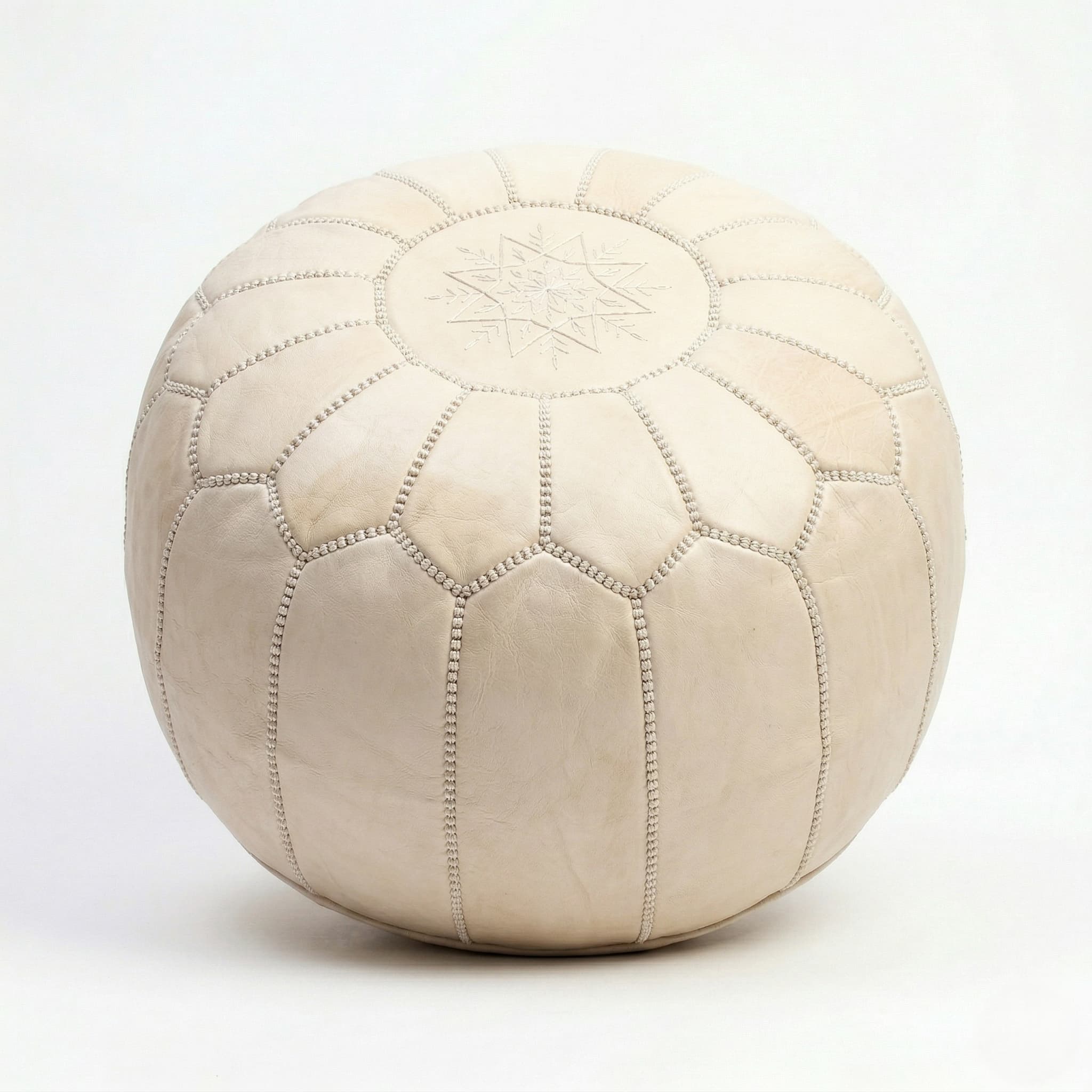 Each pouf is meticulously crafted by Omar, a master leather artisan working in Marrakech’s historic medina. The creation process spans 3-4 days per piece, beginning with hand-selecting premium undyed goatskin leather that retains its natural tan color and organic grain patterns. The centerpiece showcases an intricate eight-pointed star embroidery with radiating linear details, hand-stitched in contrasting cream thread that beautifully highlights the warm leather tones. Sixteen to eighteen geometric panels—trapezoidal and pentagonal shapes—radiate from the central medallion, creating architectural dimension and visual interest. Every seam features precise whipstitching with consistent tension, transforming functional construction into decorative artistry. The natural variations in color and texture showcase the leather’s authentic, chemical-free quality.