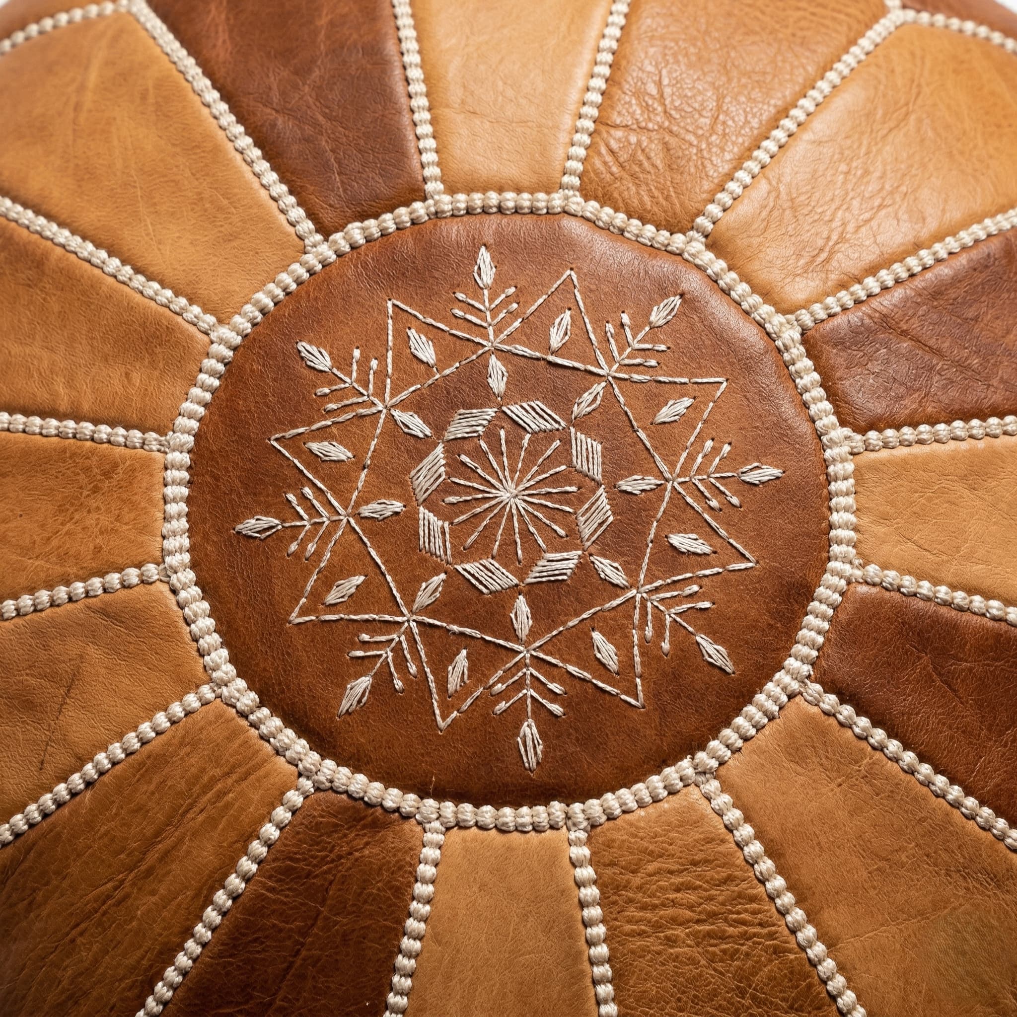 Each floor pouf is meticulously handcrafted by Omar, a master leather artisan with over 20 years of experience in Marrakech’s medina workshops. The creation process takes 3-4 days, beginning with precision-cutting 16-20 individual curved leather panels that form the distinctive petal-like radiating design. Omar hand-stitches each seam using traditional blanket stitch techniques, creating decorative contrast stitching in cream thread along every edge. The centerpiece features an intricate eight-pointed star mandala with radiating geometric branches—a traditional North African pattern hand-embroidered with meticulous symmetry. The supple, full-grain leather showcases natural tonal variations from lighter amber to deeper cognac brown, ensuring each ottoman develops its own unique character.
