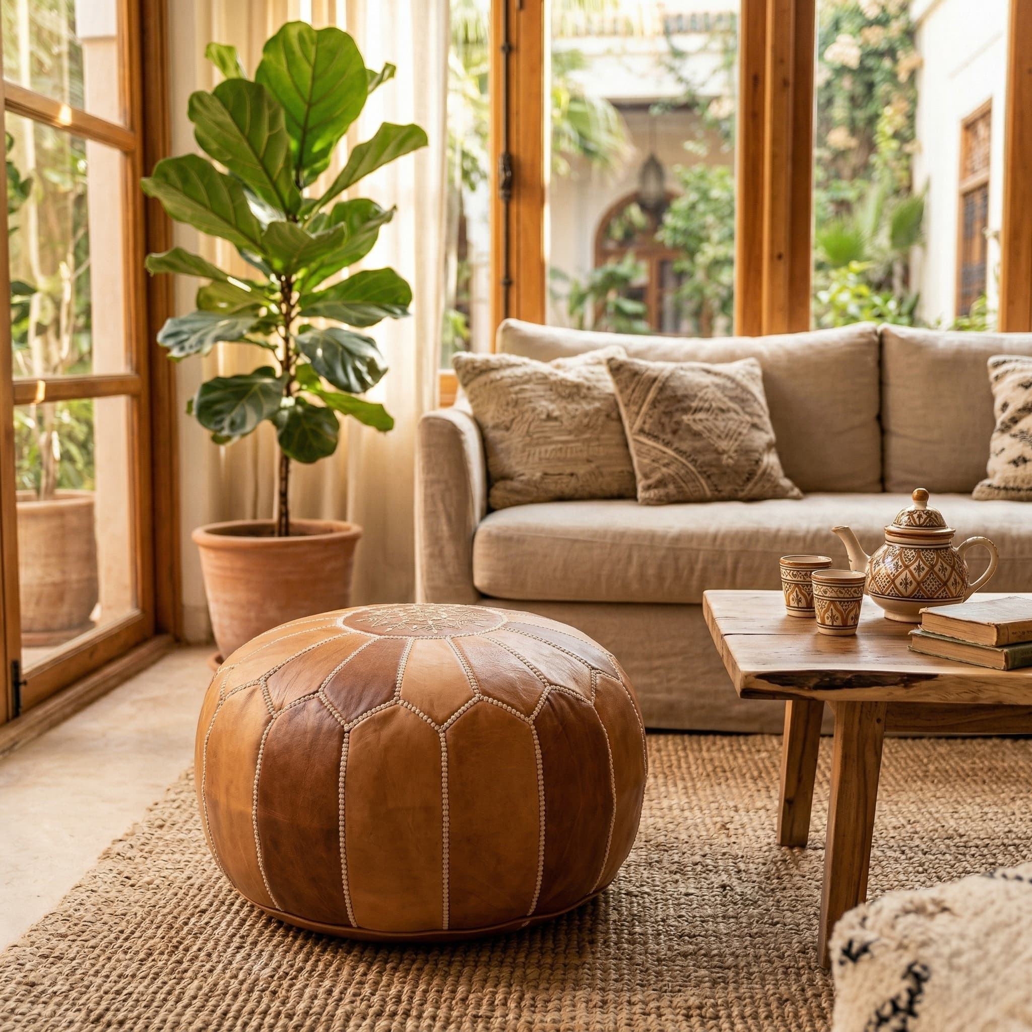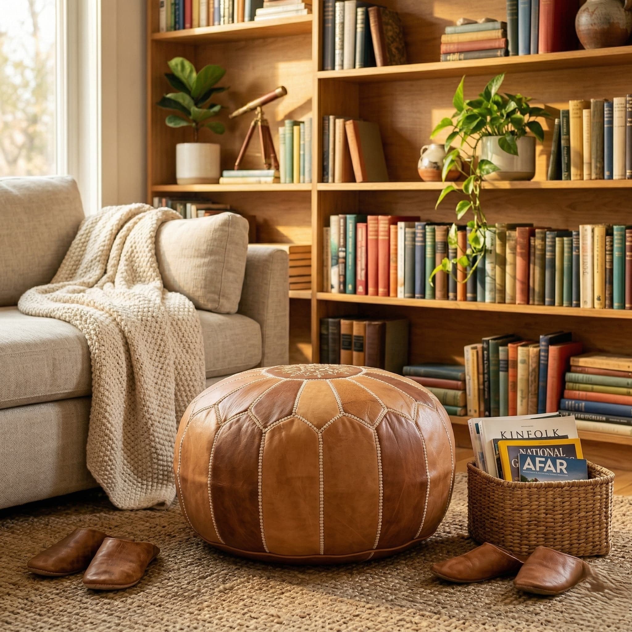 This handcrafted ottoman solves the modern challenge of space-saving furniture without sacrificing style. Its portable design adapts to your changing needs—extra seating during gatherings, comfortable foot support while working from home, or a serene meditation cushion for daily practice. By choosing this piece, you support fair-trade wages for artisan families in Morocco’s traditional workshops. The natural leather ages beautifully, developing a rich patina that becomes more characterful over time, making this a sustainable investment in timeless design rather than disposable furniture.