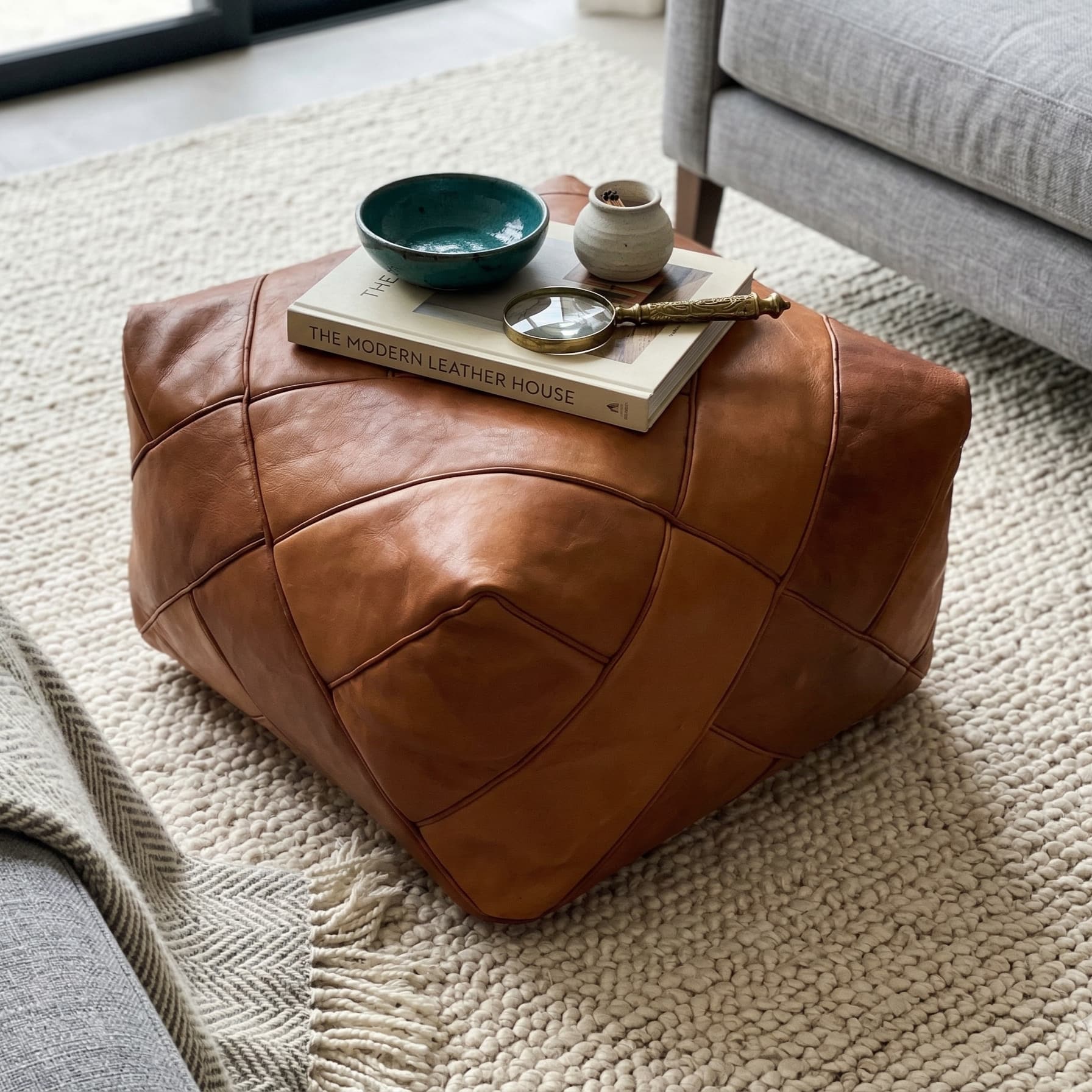 This square leather floor pouf combines contemporary cubic design with traditional Moroccan leatherwork to create the ultimate multifunctional seating solution. The distinctive diamond-pattern stitching creates a sophisticated three-dimensional texture across the warm light brown leather surface, while the clean geometric silhouette fits seamlessly into minimalist, bohemian, and modern interiors. Use it as extra seating when friends visit, a comfortable footrest while reading, a meditation cushion for your wellness practice, or pair with a decorative tray to create an instant coffee table. Perfect for small apartments where every piece needs to work harder.