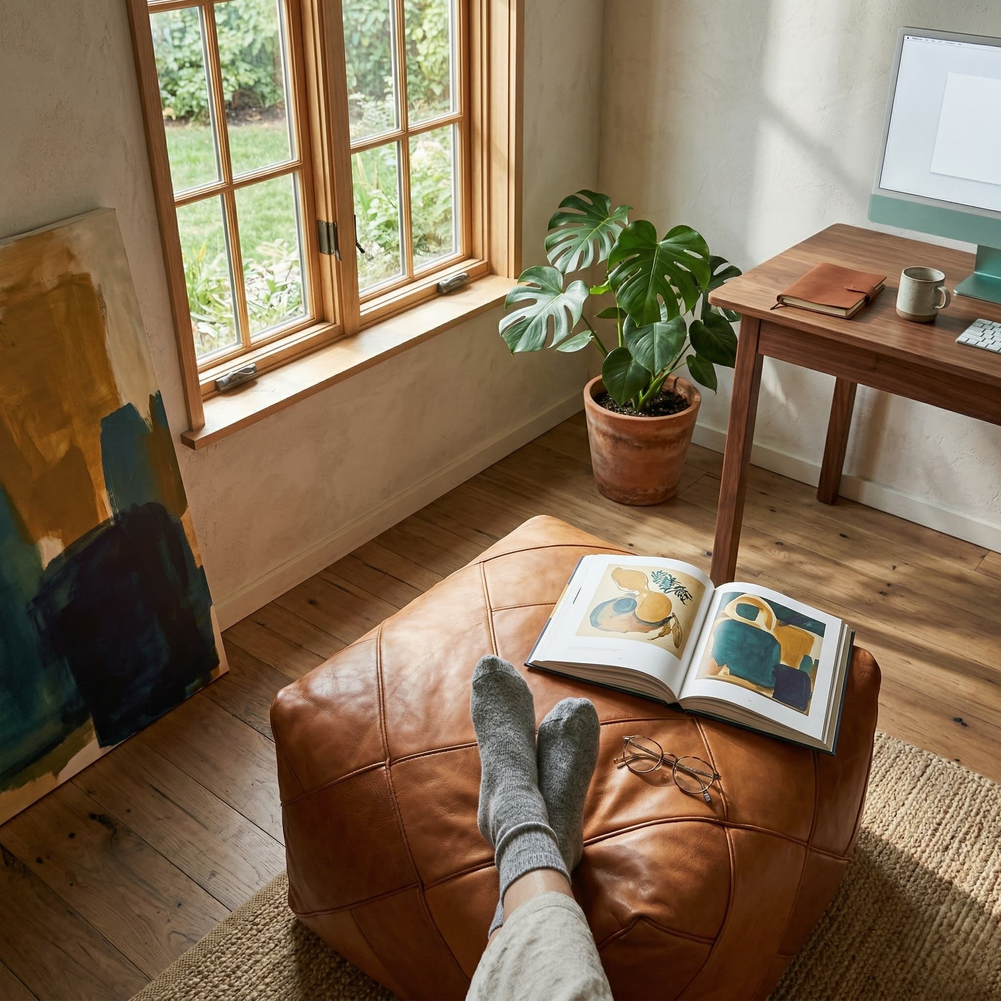 This handcrafted ottoman offers space-saving versatility for apartments and small homes while supporting artisan families through fair trade practices. The genuine leather develops a beautiful patina over time, becoming more characterful with age rather than showing wear. Its lightweight portability means you can easily move it between rooms as needs change. Layer with textured pillow covers and natural rugs to create an inviting bohemian floor seating area that encourages relaxed gatherings.