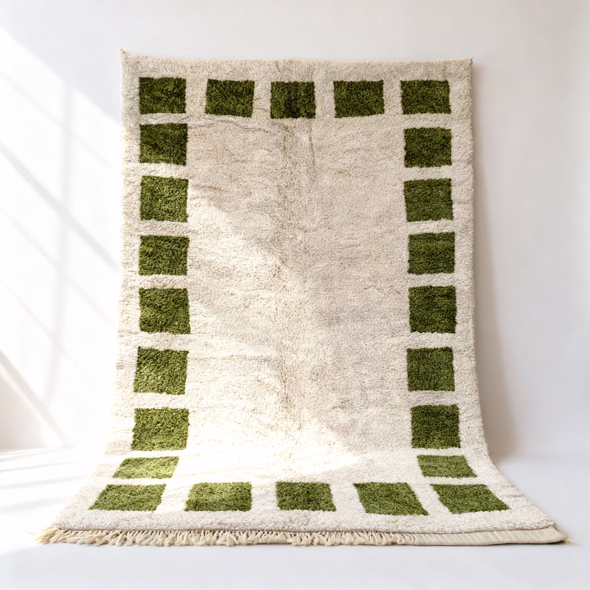 Discover the timeless elegance of our handwoven Moroccan rug, meticulously crafted by skilled artisans using traditional techniques passed down through generations. Each rug showcases a striking geometric border design with perfectly balanced squares of emerald green and natural cream, creating a stunning visual framework. The thoughtful composition features either a serene cream center surrounded by emerald squares or a rich green center framed by cream squares, offering versatile options to complement your interior design vision.