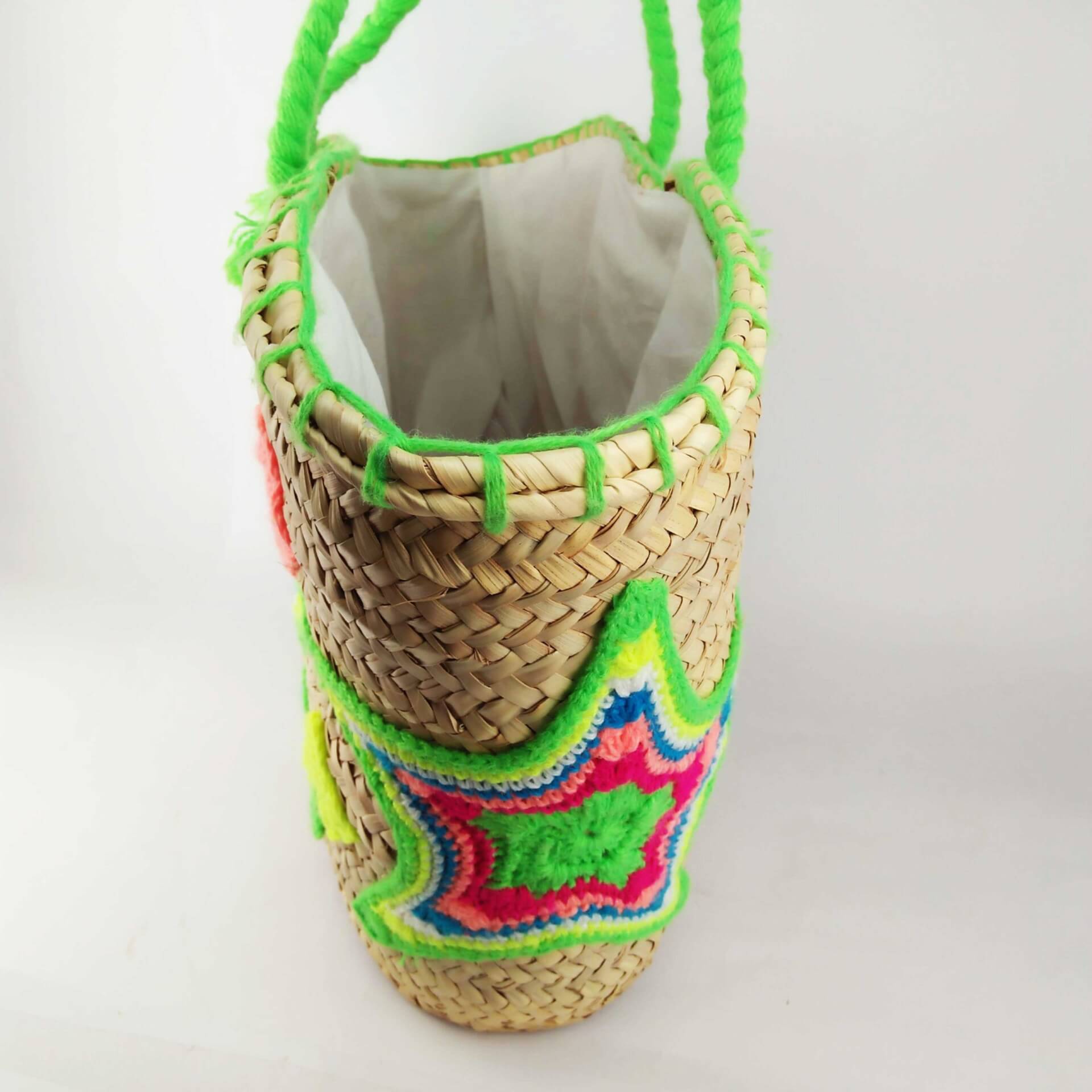 • Material: Natural woven straw basket with hand-crochet wool embroidery and braided cotton handles