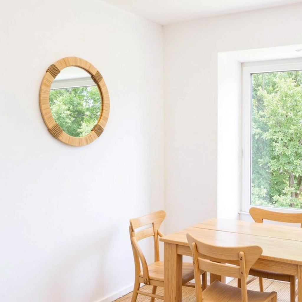 A bohemian hanging wall mirror is a handmade round mirror with raffia. The cover is made of natural linen. This cover is flexible and 100% natural, the same as raffia. The natural covering allows it to be breathable. Indulge in the Bohemian style of life with this unique home accessory.