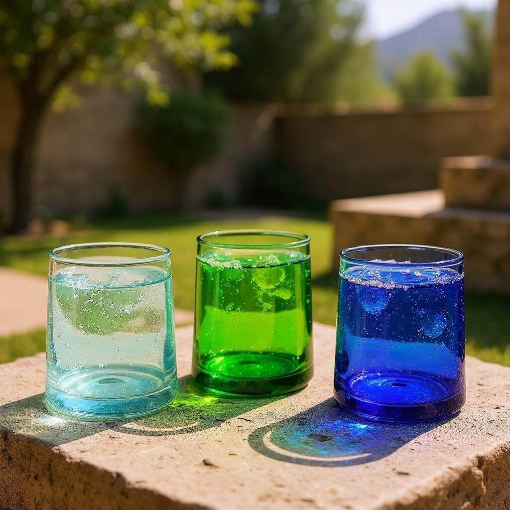 Each glass in this collection showcases traditional glassblowing artistry passed down through generations. The vibrant color palette—from rich cobalt to soft aqua and vibrant lime—is achieved by integrating metal oxides during the glass melting process, creating hues that permeate the entire glass body rather than surface coating. The distinctive cone shape requires precise breath control and timing, with each artisan carefully forming the cylindrical walls to achieve uniform thickness. Meet artisan Younes, whose workshop transforms recycled glass into these stunning functional pieces, reducing environmental impact while preserving centuries-old techniques.