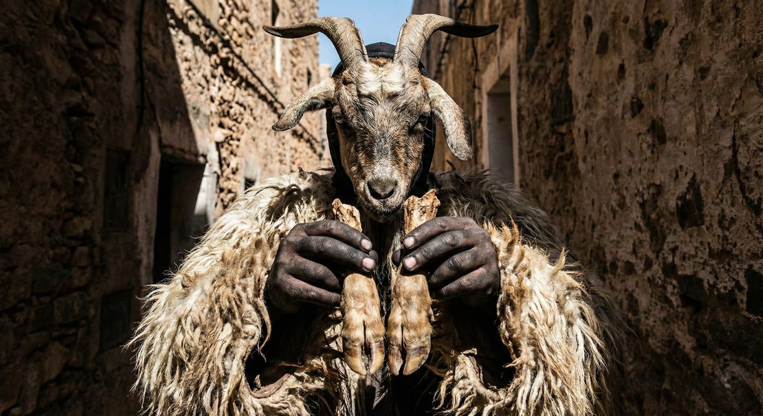 A close-up photograph of a Boujloud festival participant wearing traditional goat skins, a horned mask, and charcoal face paint in a sunlit Moroccan alley.