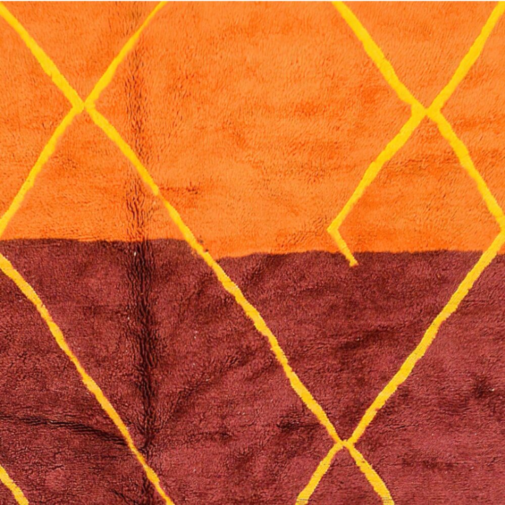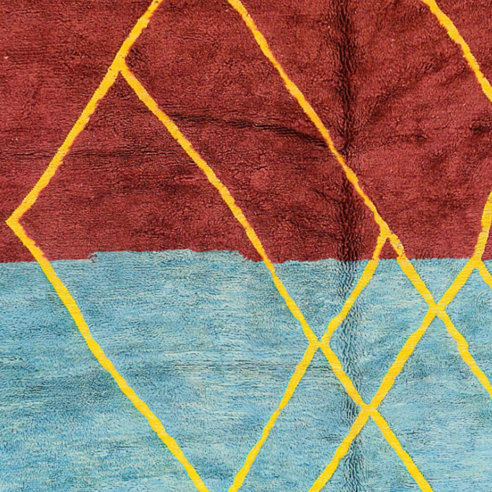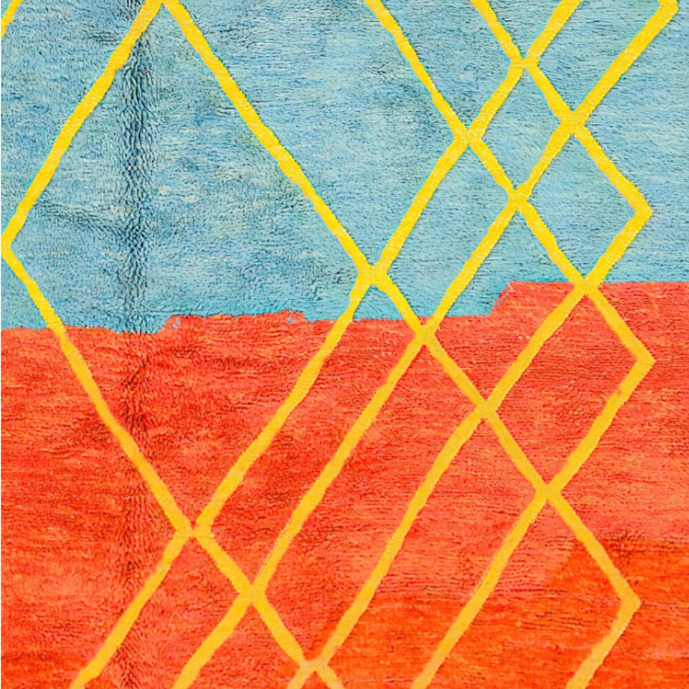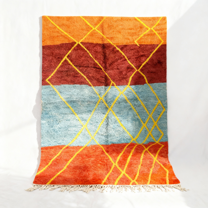 Experience the vibrant artistry of this captivating multicolor Moroccan rug, meticulously handcrafted by skilled artisans in the Atlas Mountains. Each rug represents centuries of tradition translated into a bold contemporary design that celebrates both Moroccan heritage and modern color sensibilities. The striking combination of orange, burgundy, and turquoise blue bands creates a stunning color-block effect, while the intricate yellow geometric lattice pattern overlaid across the entire surface adds depth and visual interest.