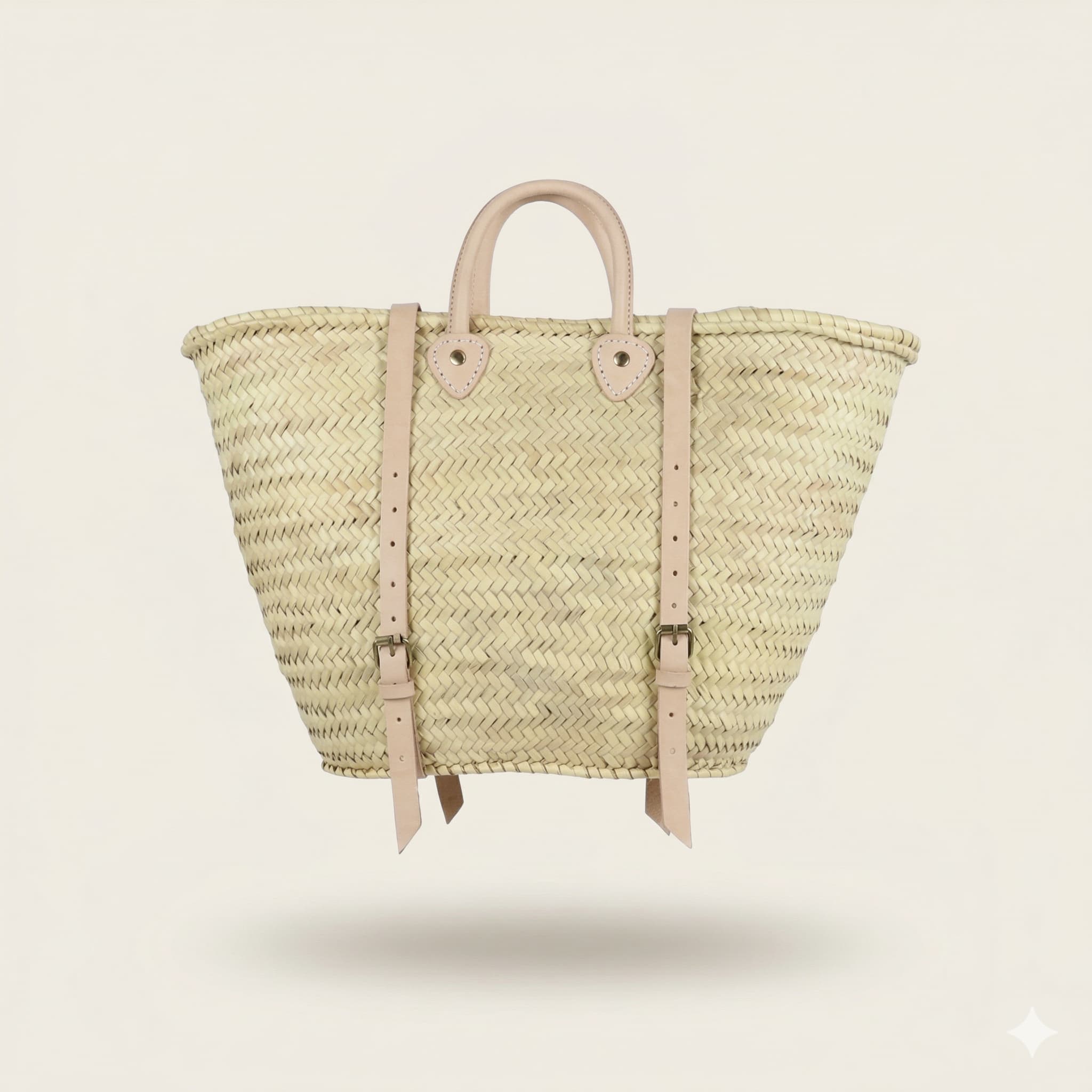 Each convertible straw backpack requires two full days of skilled handwork by artisan weaver Dounia, who prepares sustainable palm fronds and weaves them into the signature herringbone pattern with expert tension control. The cognac leather straps feature hand-braided construction and decorative stitching at teardrop-shaped reinforcement points, where silver rivets secure the convertible system. This traditional basket-weaving technique creates a rigid structure that maintains its elegant shape while the adjustable buckles allow seamless transitions between carrying styles.
