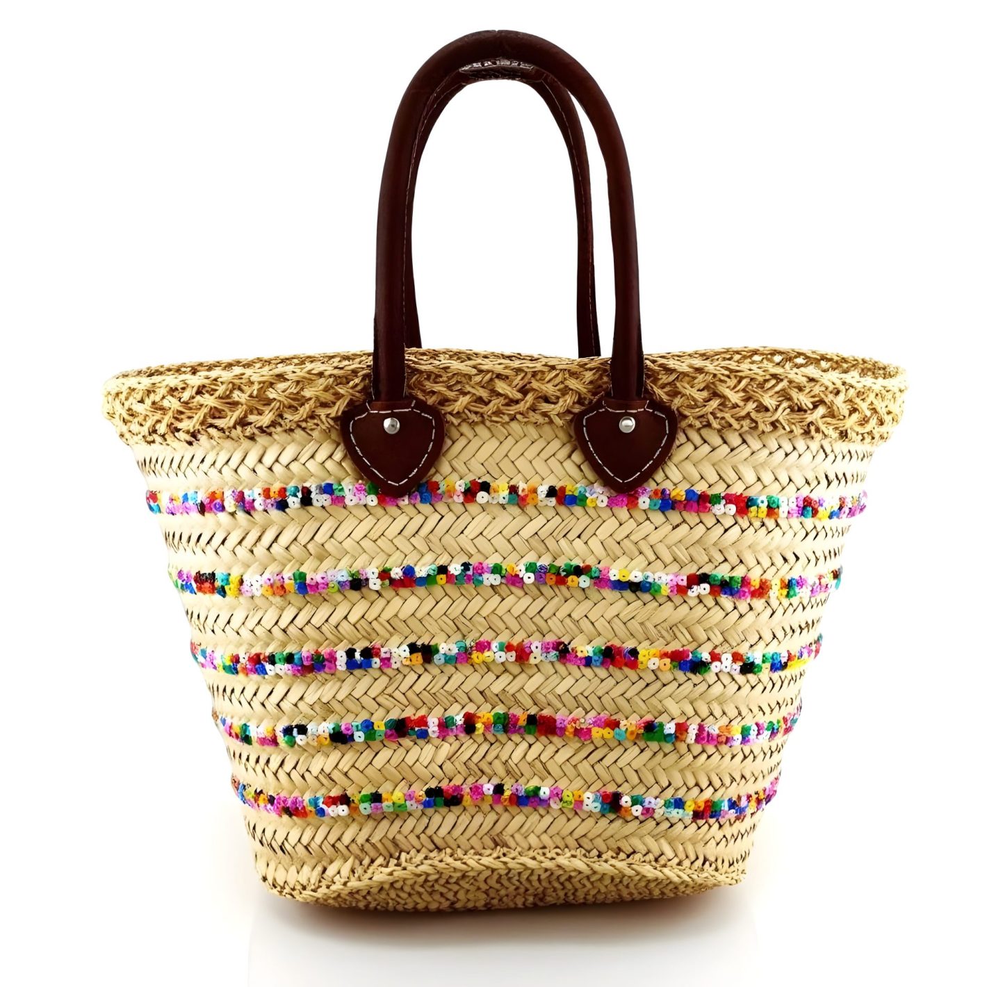 Each summer straw bag is lovingly handcrafted by skilled artisans who weave natural straw into a sturdy base before adding rows of vibrant sequins. The alternating pattern creates a mesmerizing rainbow effect that catches the light beautifully. Premium leather handles complement the design while ensuring durability and comfort.